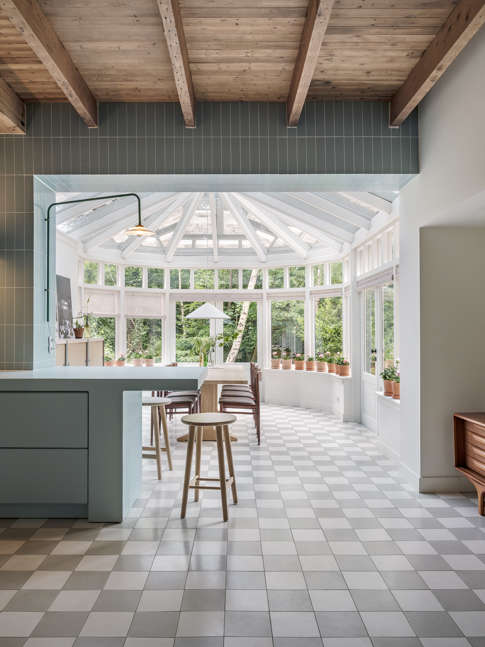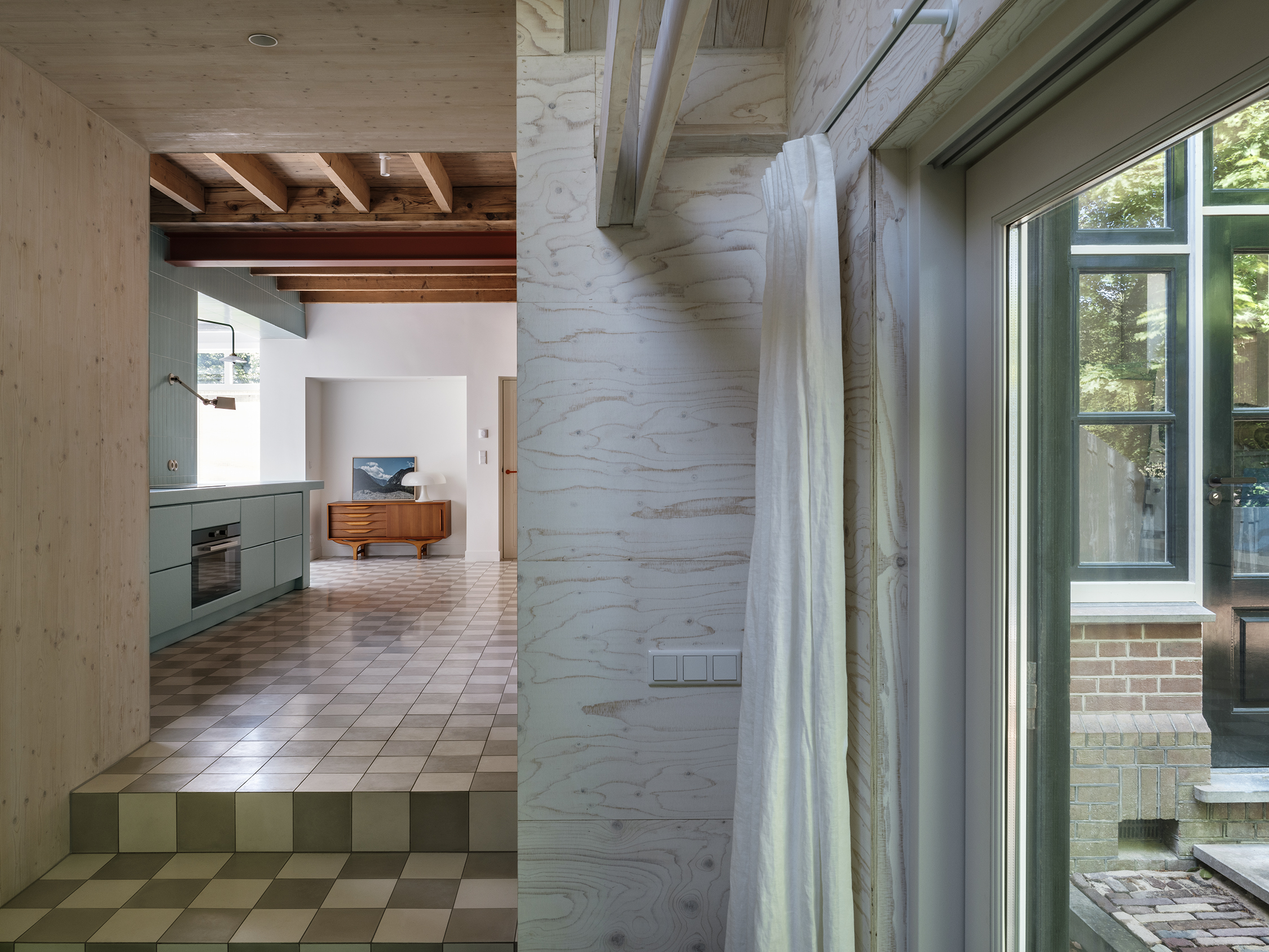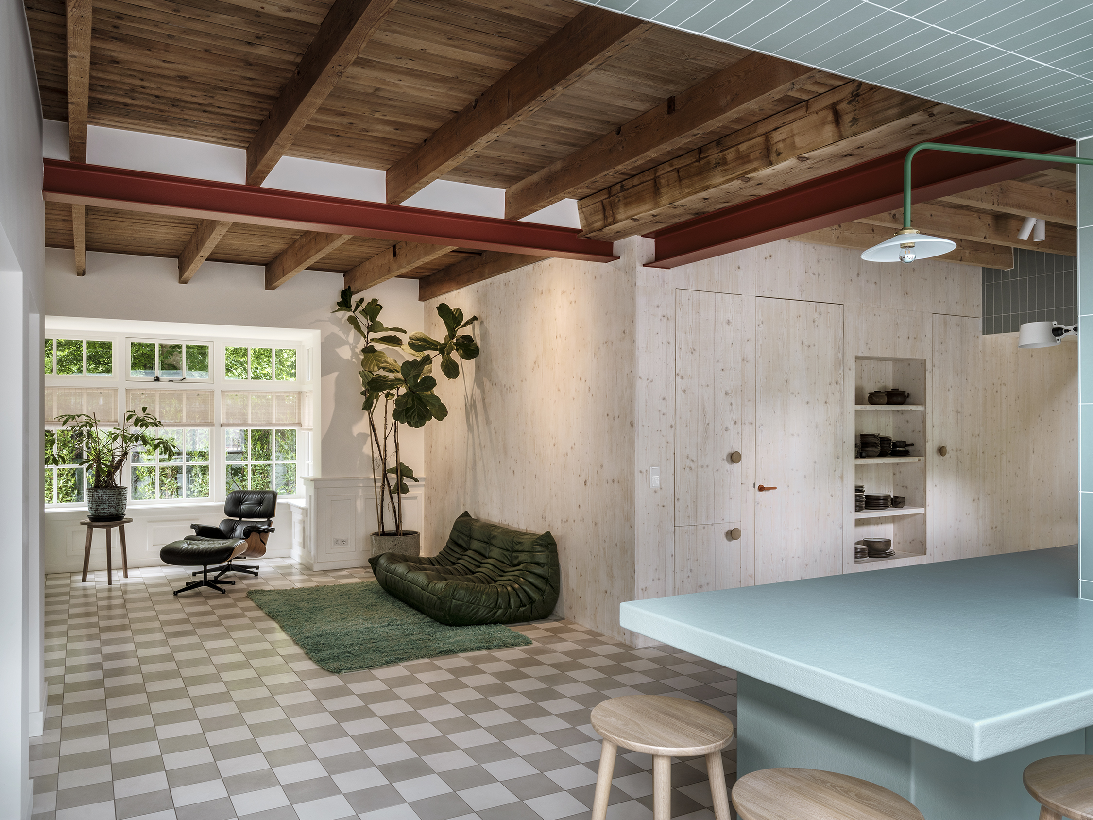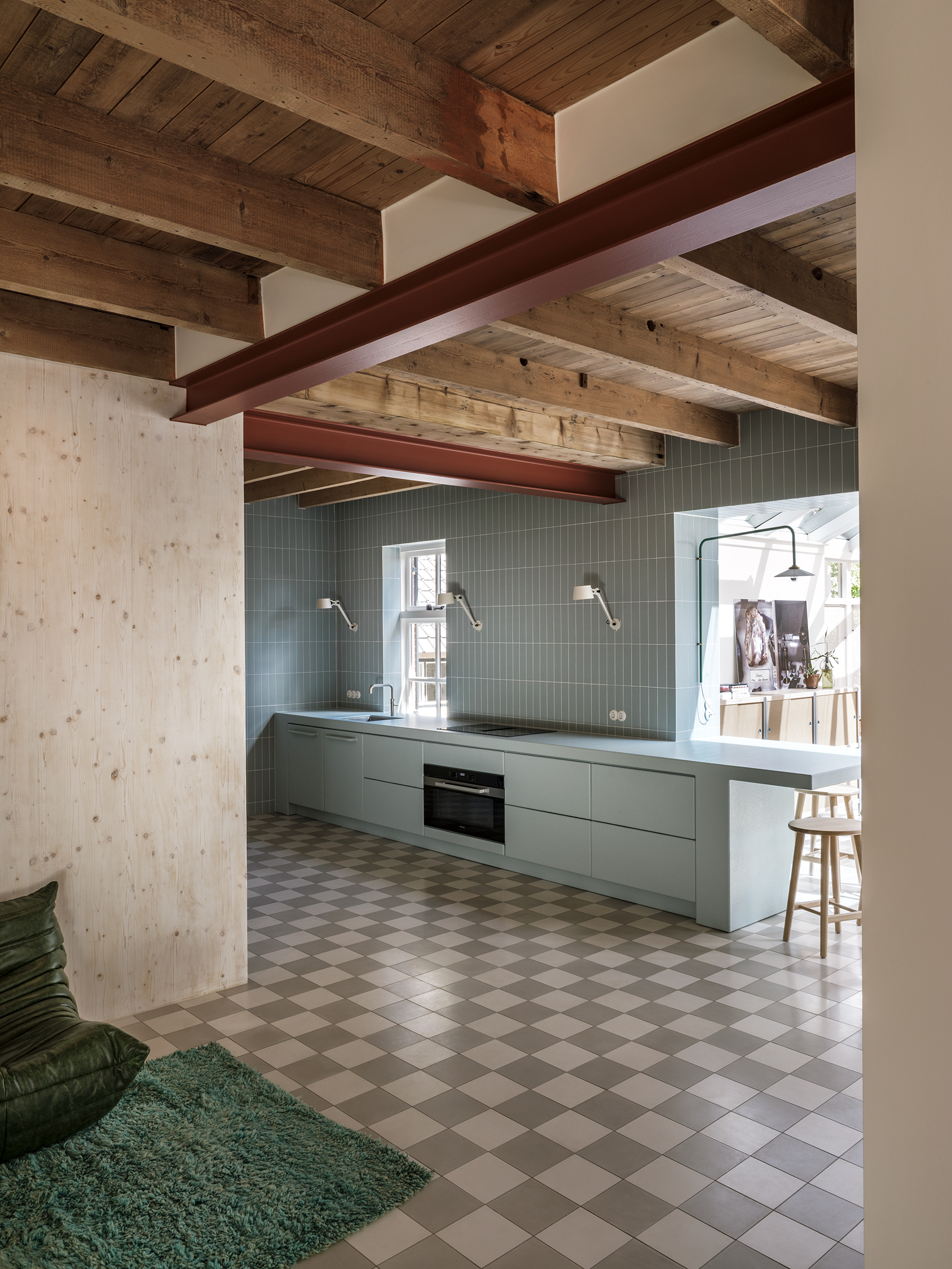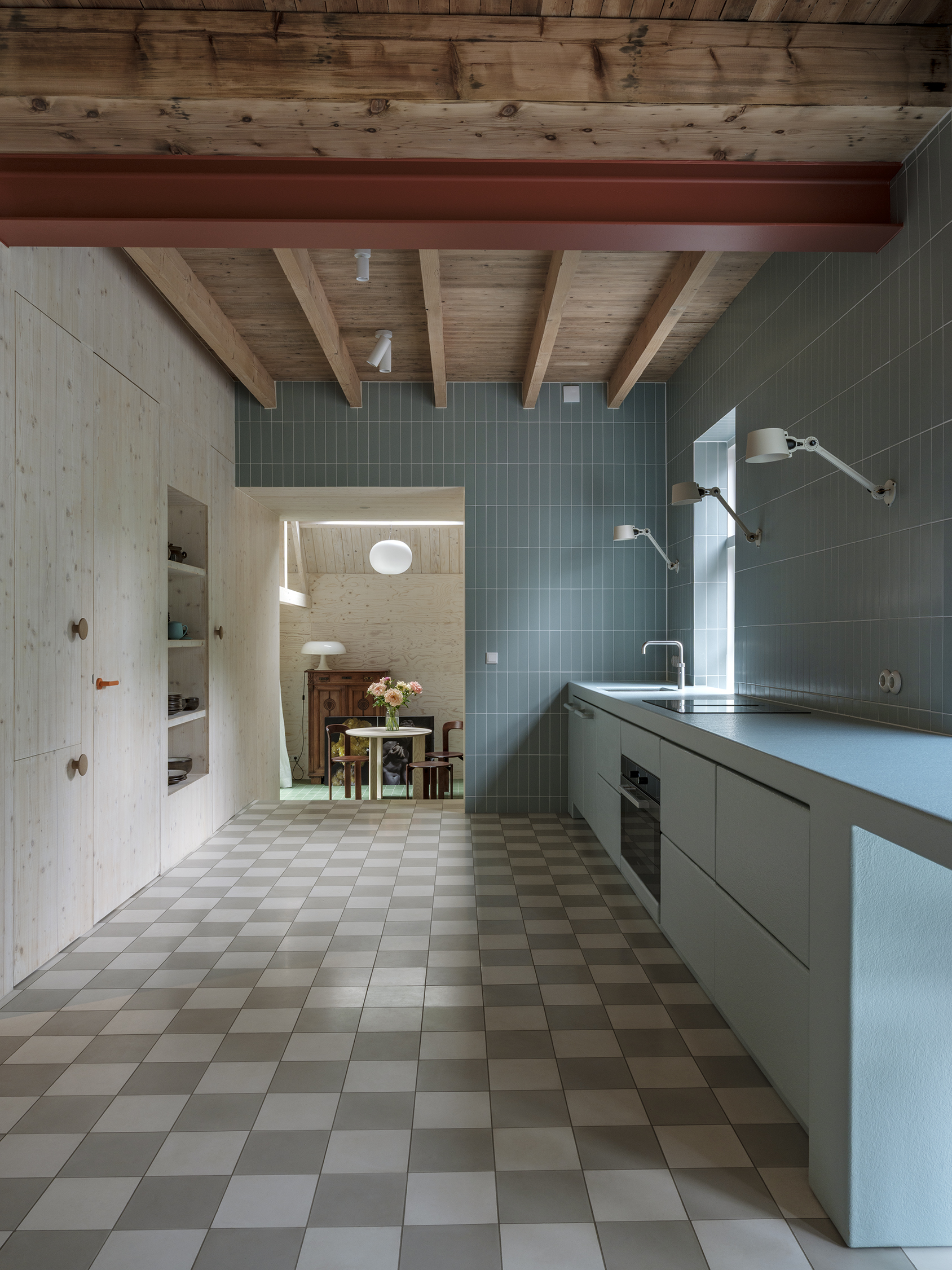 The interior combines soft, natural finishes with raw, expressive elements. Original ceiling beams and red-painted construction beams were left exposed, adding character and contrast to the muted palette of wood, plaster, and linen. A blue-toned kitchen forms a bold yet balanced focal point, grounded by a checkerboard-tiled floor that adds rhythm and a sense of play.